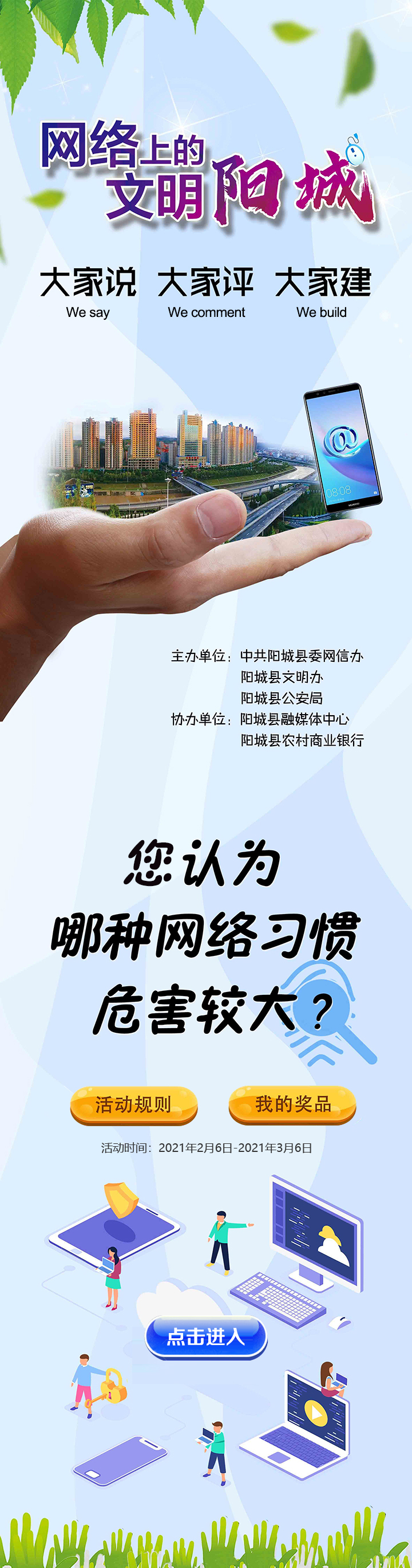 "網(wǎng)絡(luò)上的文明陽城大家說大家評大家建"微信答題抽紅包活動由陽城縣委宣傳部、陽城縣公安局、陽城縣農(nóng)商行聯(lián)合承辦,旨在防范網(wǎng)絡(luò)電信詐騙,提升本地群眾的用網(wǎng)安全習(xí)慣。