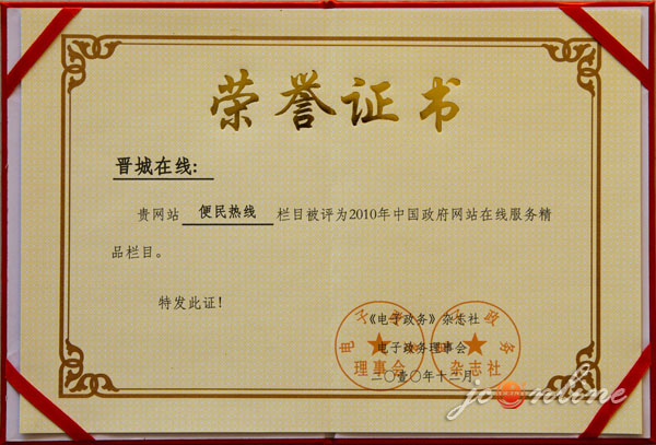 近年來,“晉城在線”已成為山西省內(nèi)外知名的信息站點,先后獲得了“中國城市門戶網(wǎng)站十大公信品牌”、“2008年中國政府門戶網(wǎng)站優(yōu)秀獎”、“2009年中國政府門戶網(wǎng)站優(yōu)秀獎”、“中國優(yōu)秀誠信品牌”、““2008年中國政府門戶網(wǎng)站信息公開領(lǐng)先獎”、“全國地方門戶網(wǎng)站十佳品牌”、“全國地方網(wǎng)站最具創(chuàng)新發(fā)展?jié)摿ζ放啤、?010年中國政府網(wǎng)站領(lǐng)先獎”等諸多榮譽(yù)稱號。